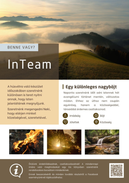 De jó lenne, ha az idei nagyböjtöt igazán meg tudnám élni! Vágyom Isten közelségének mélyebb megtapasztalására! Szeretnék mélyülni az imádságban, és igazi lelkiéletet élni! Hű, de jó lenne társakkal együtt haladni az Úr felé, egymást támogatva az úton! Ha ilyen és ehhez hasonló gondolatok már megfordultak benned, akkor van egy jó hírünk: meghívunk egy nagyböjti lelkigyakorlatos készületre, az InTeam-be, melynek keretében Isten közelségét tapasztalnánk meg közösségben másokkal. Benne vagy?