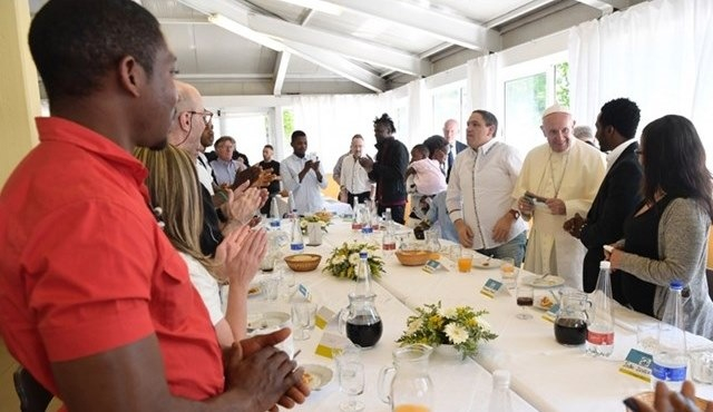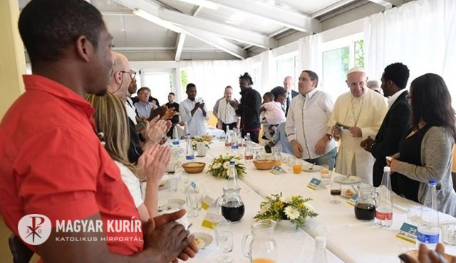 Ferenc pápa szegényekkel és menekültekkel étkezik Genovában