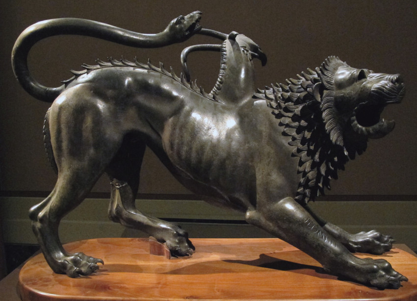 A kiméra az antik mitológia oroszlánfejű, kecsketestű, kígyófarkú, tűzokádó lénye, de átvitt értelemben rémlátomásra vagy valamilyen rögeszmére is utalhat. Nem mellesleg említsük meg, hogy az arezzói kimérát szintén az etruszk művészettörténet kimagasló emlékeként tartjuk számon.