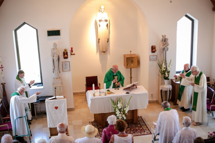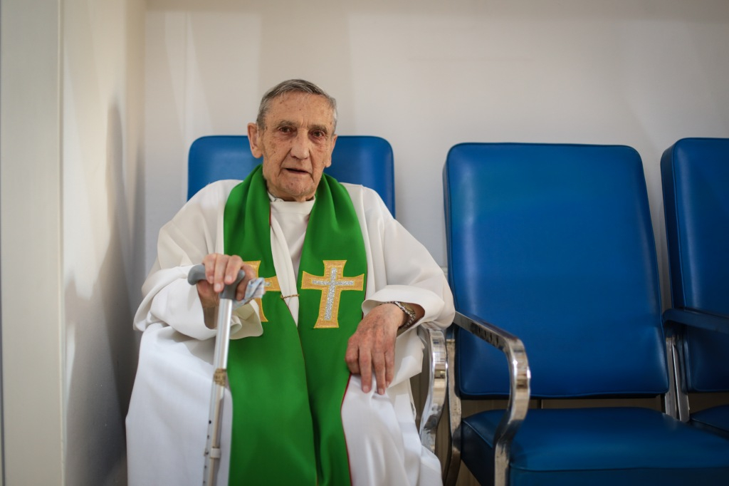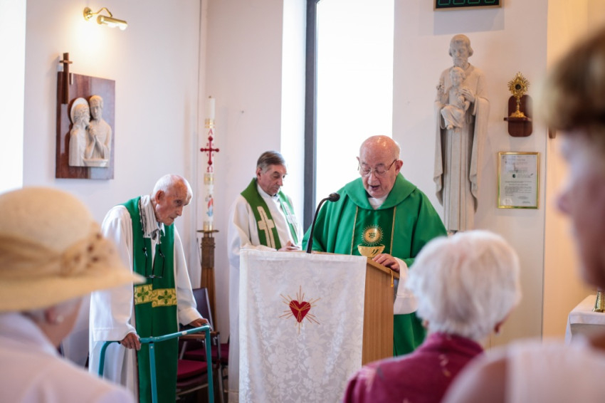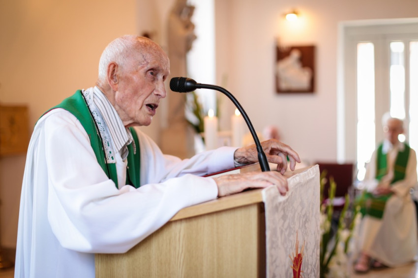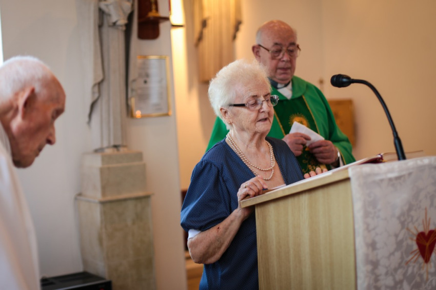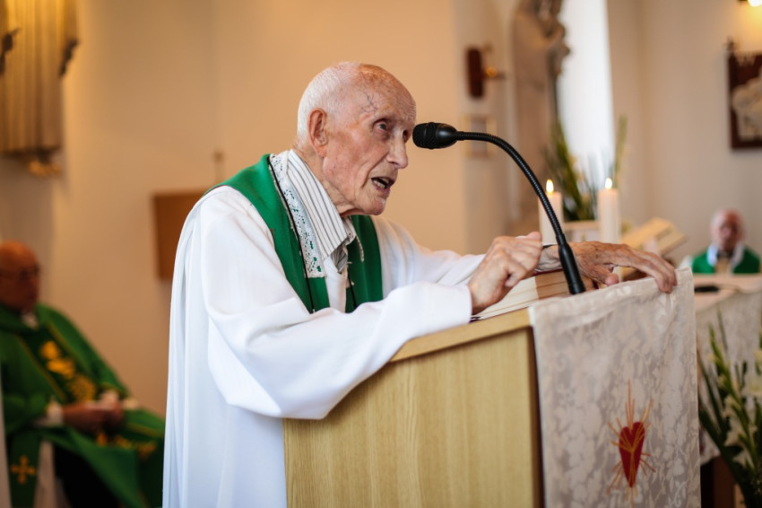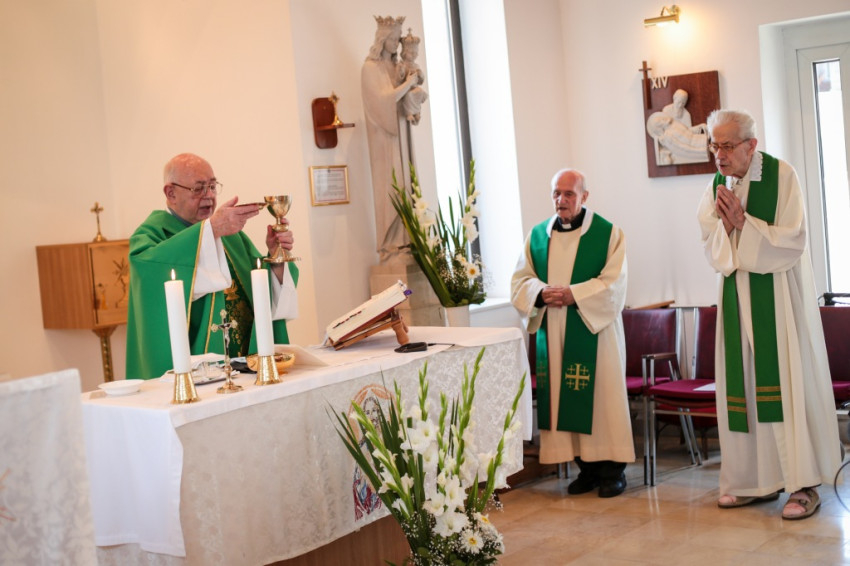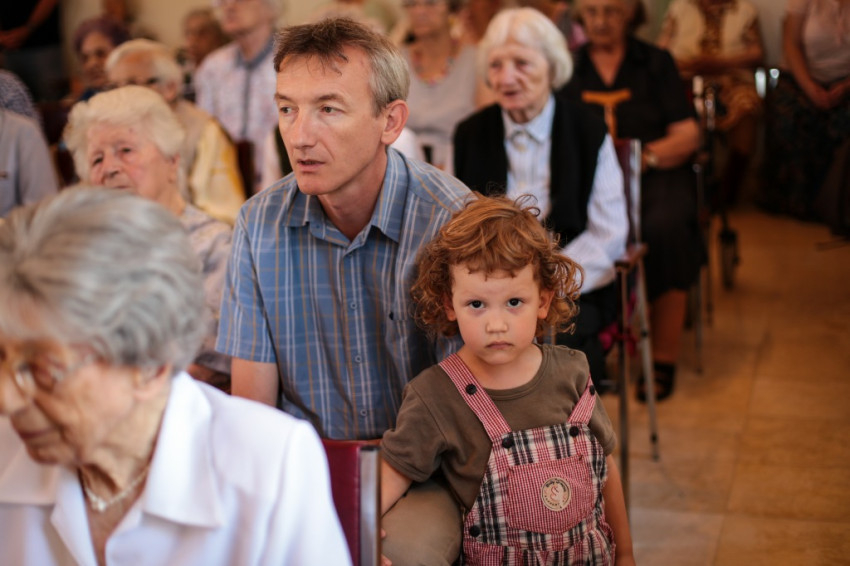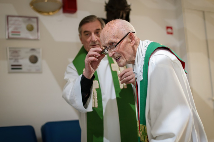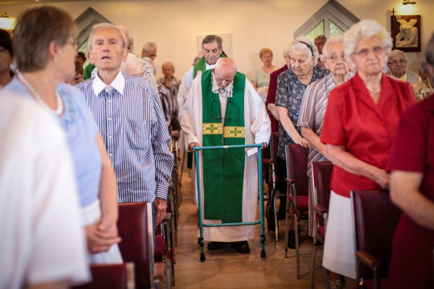 Vasmisére igyekszünk Pilisvörösvárra. Generációk lelkivezetője, a 91 éves Futó Károly atya a Szent Erzsébet Otthonban mutatta be élete nagyjából 30 000. szentmiséjét. A kápolnát néhány vendég kivételével a ház lakói töltik meg. A kerekesszékek között alig találunk helyet. Csendes imában várakoznak, tekintetük az irgalmas Jézus-arcon, míg bevonul a vasmisés öt paptársával. Mindannyian a Manhertz Erzsébet SJC alapította otthon lakói.