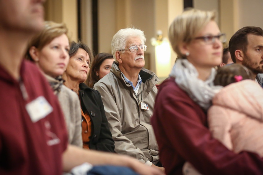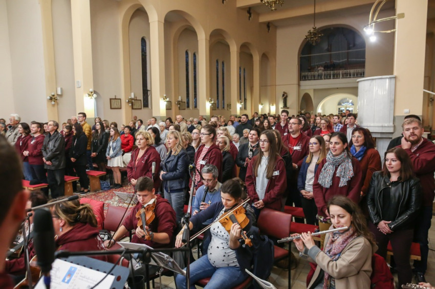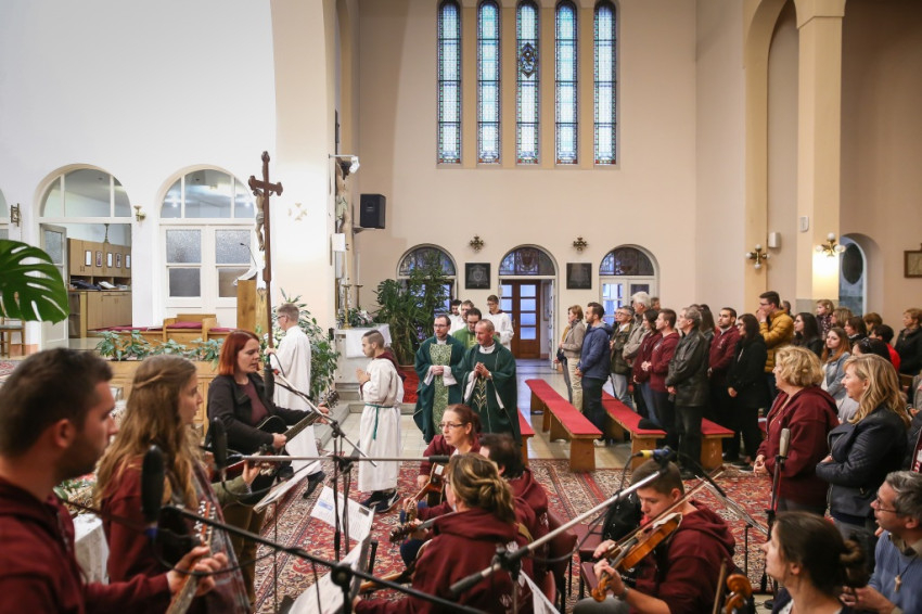 A közeli Jézus Szíve-templom megtelik a püspöki misére. A prédikáció témája az evangelizálás. Sötétségtől szenved a világ, és mi nem segítünk rajta. Másokért, a világért kell élnünk. Hogy hányan hallják meg az örömhírt, tőlünk is függ, hangsúlyozza Varga László.