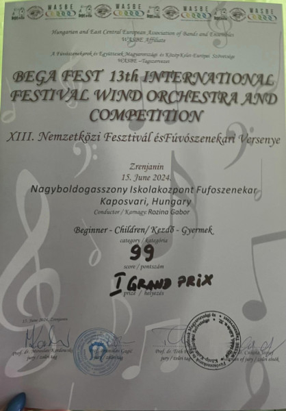 „A belefektetett rengeteg munka és idő megtérült, a zenekar 99/100 ponttal elnyerte a Grand Prix díjat. A Nagyboldogasszony Iskolaközpont zenekara érte el korcsoportjában a legmagasabb pontszámot, a teljes mezőnyben csak a hódmezővásárhelyi katonazenekar kapott magasabb pontszámot professzionális kategóriában” – mondta el a verseny kapcsán Rozina Gábor karmester, aki rengeteg energiát és pluszmunkát fektetett a zenekar igényes és színes hangzásának kialakításába.