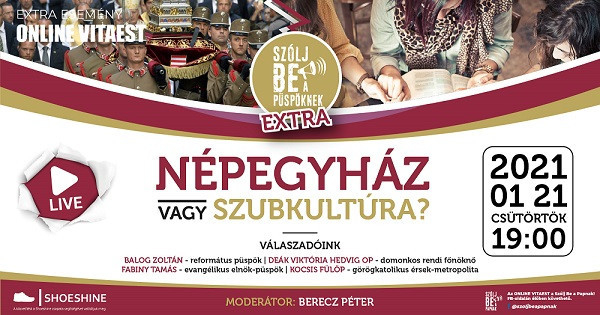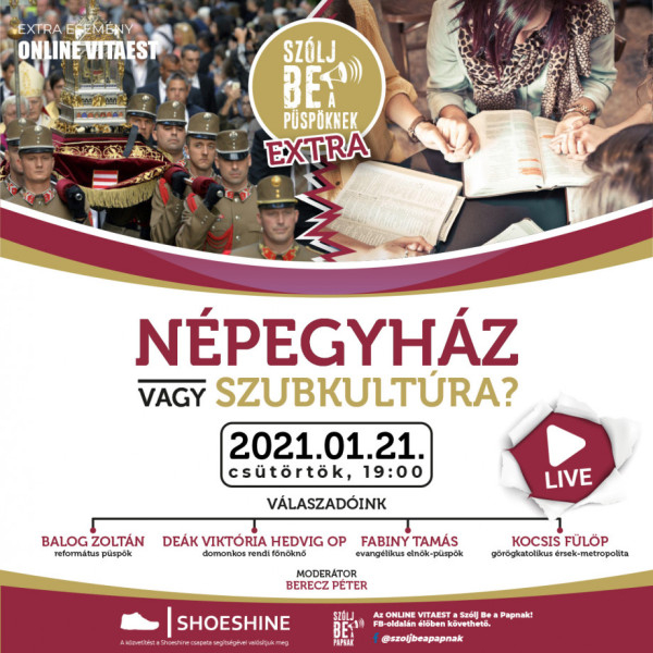 Balog Zoltán református püspök, Fabiny Tamás evangélikus elnök-püspök, Kocsis Fülöp görögkatolikus érsek-metropolita mellett a január 21-én 19 órától a Facebook-oldalon rendezett vitaesten Deák Viktória Hedvig domonkos rendfőnöknő is válaszol az Egyházat érintő kérdésekre. A Népegyház vagy szubkultúra? címmel meghirdetett beszélgetés 20.30-ig tart, bárki csatlakozhat az eseményhez, melynek moderátora Berecz Péter, a „Szólj be a papnak!” kezdeményezés alapítója lesz.