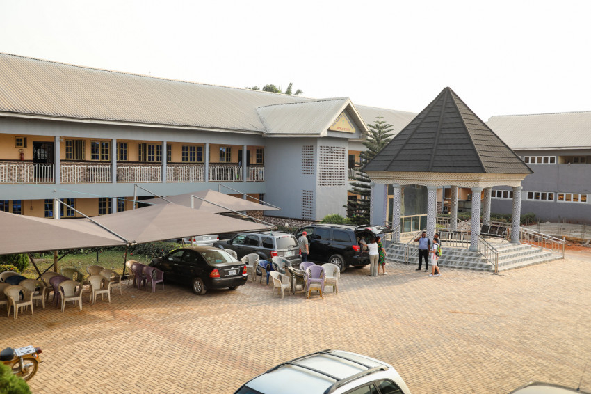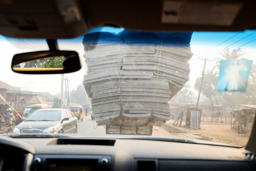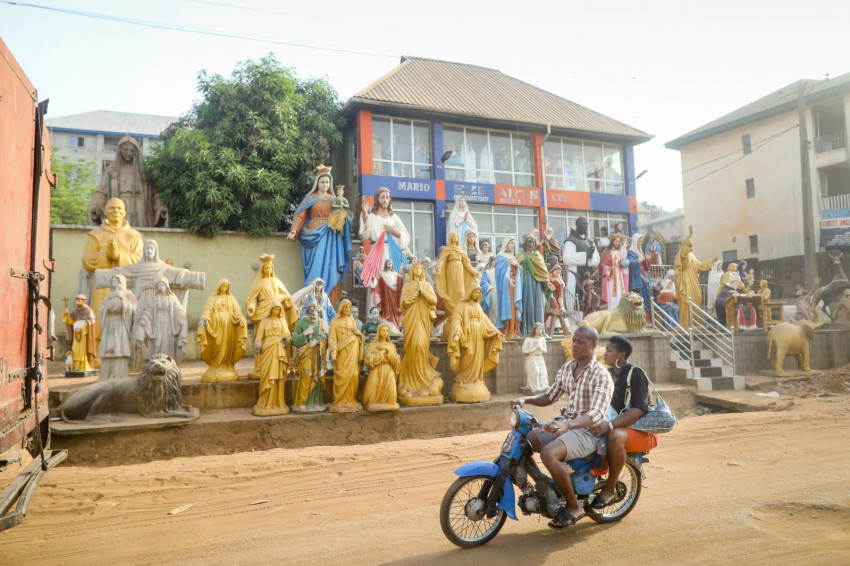 Awka-Etiti alig harminc kilométernyire, autóval szerencsés esetben egy órányira van Onitshától. Szerencsétlen esetben ez állítólag négy-öt óra is lehet. A göröngyös utakon hol jobbról, hogy balról jönnek szembe a jellegzetes, sárga motoros riksák, csordultig pakolt furgonok, motorok, autók; az út mentén árusok, kis asztalkáikon avokádóval, kókusszal, jamgyökérrel, magvakkal, banánnal és még megszámlálhatatlan gyümölccsel, közben egy-egy üzlet, ahol óriási Mária- és Jézus-szobrokat vagy számunkra felismerhetetlen alakokat árulnak, ruhák, cipők, csetreszek között óriás kovácsoltvas, és ki tudja, miből összetákolt kapukat kínálnak… Jó lenne kiszállni és belekavarodni a forgatagba, de nem szabad, vigyáznak ránk.