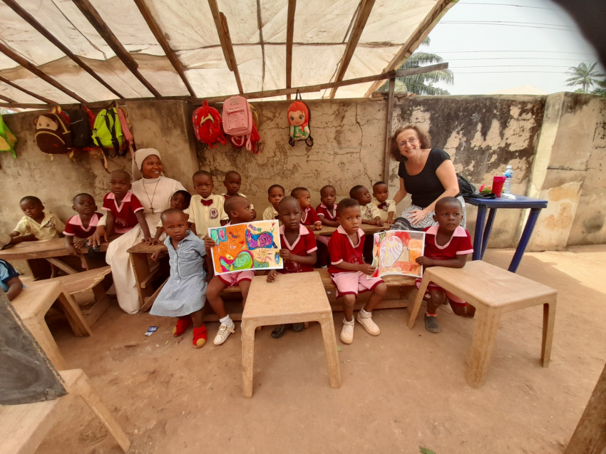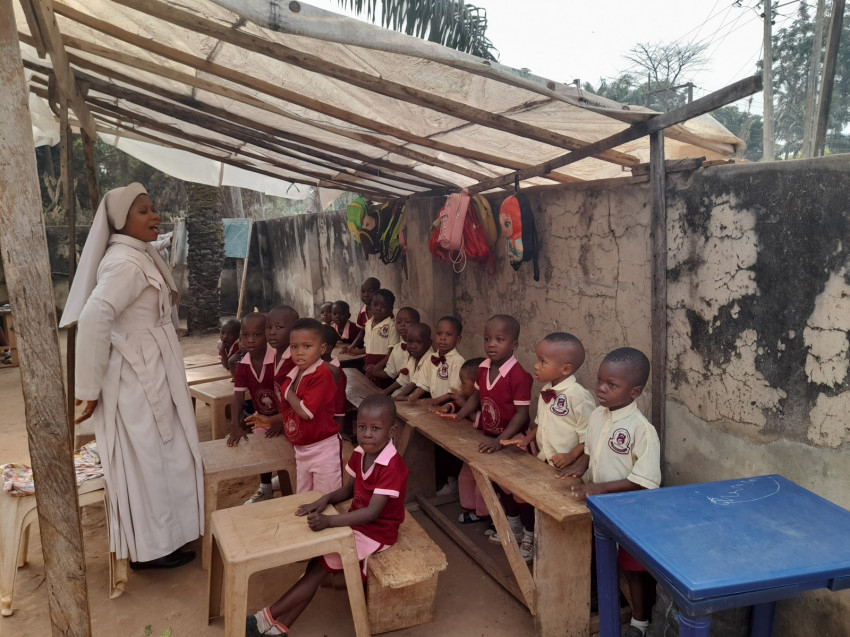 Az óvodától az általános iskoláig járhatnak ide, az osztályok nagy része a kertben tanul, egy táblára írják a nővérek az anyagot, ők pedig másolják a füzetükbe. A kicsik bemutatták, mit tudnak: mondókákkal, énekekkel tanulják a testrészeket. A nagyobbak bámulatos műsorral készültek: énekeltek, mutogatással, tánccal kísérve, a csupa mosoly szerzetesnővérek irigylésre méltó ritmusérzékkel ott pörögtek, táncoltak közöttük.