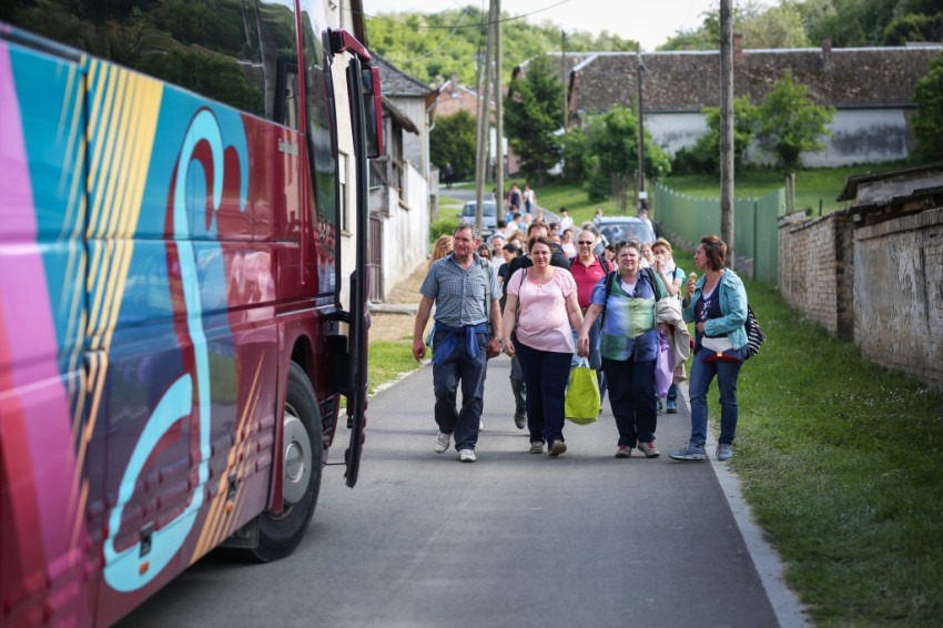 Autó érkezik, és vizet kapunk. Némi pihenő után egy hídon haladunk át, a patakban hattyúk lebegnek méltóságteljesen. Ekkor már másfél órája gyaloglunk. Valamivel odébb hatalmas jegenyék közé érkezünk, hosszú idő után végre árnyékba. Feltűnik a „mentésünkre” Bátáról küldött busz: nagy késésben vagyunk, sietnünk kell a misére.