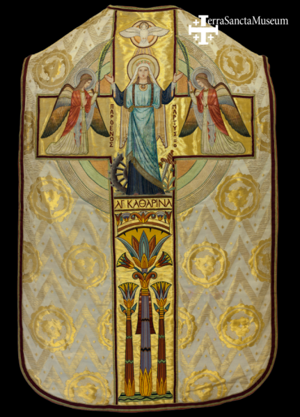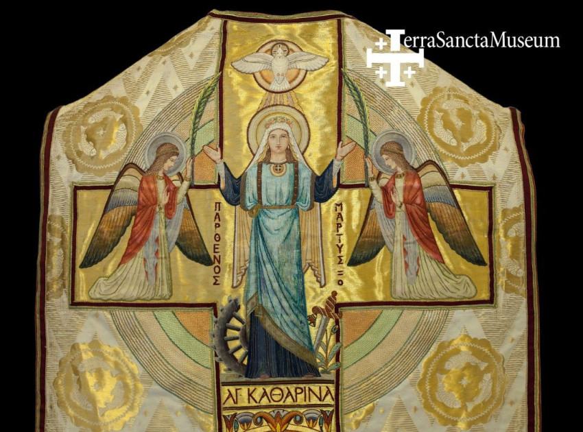 Egyik legérdekesebb ábrázolása a Terra Sancta Múzeum gyűjteményeiben a képen látható osztrák miseruha 1932-ből. Az alexandriai ferences kolostor számára készítették; ma Betlehemben őrzik. A szentet kínzása két eszközével ábrázolja, kétoldalt két angyal a vértanúk pálmaágaival – ugyanaz a két angyal, mint akik összegyűjtötték földi maradványait, és eljuttatták a Sínai-hegyre. A díszítőelemek egyiptomi stílusúak, papiruszvirágok és -oszlopok; a tárgy a korra jellemző art deco jegyeket hordoz.