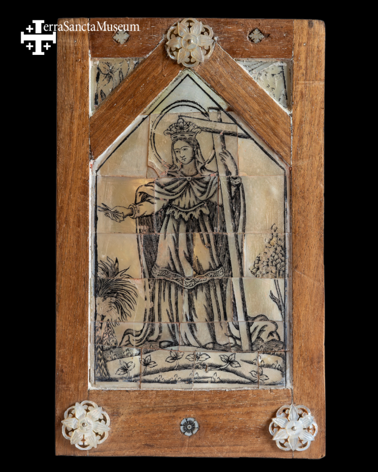 A palesztinai kézműves alkotás, amelyen igazgyöngyre rajzolva látható Szent Ilona alakja, a 18. században készült – különlegessége, hogy a császárné egyik kezében a keresztet tartja, a másikban a szenvedés eszközeit, a szögeket, melyeket a hagyomány szerint a kereszttel egyidőben talált meg.