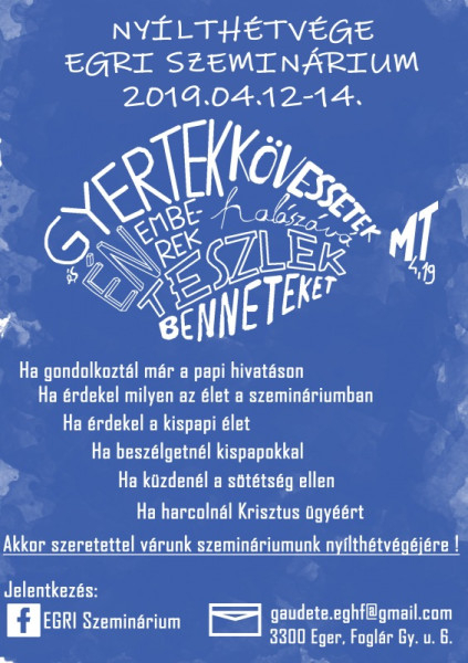 A jelentkezés határideje: 2019. április 6. Jelentkezni az egri szeminárium Facebook-oldalán üzenetben vagy a következő e-mail-címeken lehet: szabo.jozsef.69@egriegyhazmegye.hu vagy gaudete.eghf@gmail.com.
