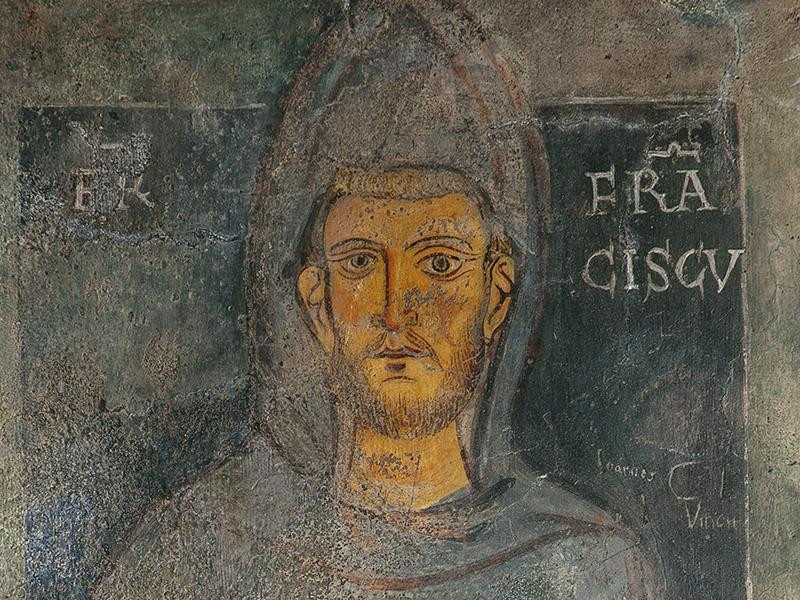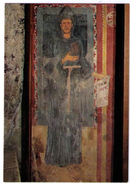 Ferenc ekkor már híresen és közismerten Isten embere, falvak, városok szaladnak utána. Subiacóban részt vesz a monostor új, Nagy Szent Gergely pápa tiszteletére épített sziklakápolnájának felszentelésén, melyet atyai barátja és tisztelője, Ugolino bíboros, ostiai érsek, a későbbi IX. Gergely pápa végez, aki Ferencet 1226-os transitusa után két évvel szentté avatja. Istennek hála, a kápolna falán egy ismeretlen, de fölötte tehetséges mester megfestette az oltárszentelés jelenetét, amint Ugo püspök krizmával fölkeni az oltárt, s imáját a nyitott szertartáskönyv máig hirdeti: „Vere locus iste sanctus est!”, „Valóban szent ez a hely!” Az oltár fölé hajló püspök és a mögötte álló, keresztet tartó ministráns közt föltűnik Ferenc arca, de – minthogy szent ez hely – az ismeretlen festő később önállóan megfesti Franciscust, és éppen ezt a freskót hirdeti az októberi Adoremus címlapja. Minthogy élő kortársát festi, így nevezi meg: Frater Franciscus – Ferenc testvér, pedig szíve szerint már most becserélné a FR frater rövidítést a ST, a Sanctus – szent két betűjére. Tesz is érte egy vargabetűt, igaz játékossággal. A megelőző korok ikongráfiája a szentnek tartott élő személyeket a „signum viventis”, az „élőnek jele” négyszögletes nimbusszal ruházta föl, a szentség dicsfényének karikája helyett. A fej körül szokásos négyszögletes glóriát azonban a test mögé húzza szét, és abban helyezi el Ferencet, a szentség természetfölötti, kiérdemelhetetlen, de megküzdött kontextusában. Kezein nem láthatók a La Verna hegyén 1224. szeptember 14-én, Szent Kereszt felmagasztalása ünnepén megkapott stigmák, így a kép ezek szerint annak előtte készülhetett. Jobbja az oltárszentelés jelenetére, illetve a titulus Nagy Szent Gergely pápára utal, akinek Szent Benedek életrajzát vélhetőleg ismerte is. Balja írástekercset mutat, rajta üzenettel: „Pax huic domui”, „Békesség e háznak!” Tudjuk, Ferenc alapvető evangélium élménye Jézusnak az apostolok kettesével szétküldése: Menjetek! Menjetek felszereletlenül és ha beléptek egy házba, mondjátok: Békesség e háznak! (vö. Mt 10). És valóban, a szürke csuhába öltözött Francesco mezítlábas, a nyolccsomójú kordát is csak később festették oda, nehogy bencésnek nézzék. Nincs tarisznyája, se botja, se két ruhája és biztos egy árva fillére sem! Ferenc nem méricskélt, szíve egész szeretetével szó szerint értette Jézust és éppen ez fogta meg annyira az embereket. Ferenc abban is jézusi, hogy egyszavas üzenetét viszi: Pax! Hiszen az Üdvözítő, amikor köztünk körül-járt, ezzel a szóval mindent kifejezett, ami persze ő Maga, a Minden. Ezért toldotta meg a békét annak mindenféle jót kifejező tartalmával: Pax et Bonum! Milyen rövid és mily csodálatos programok: Ora et labora! Pax et Bonum!