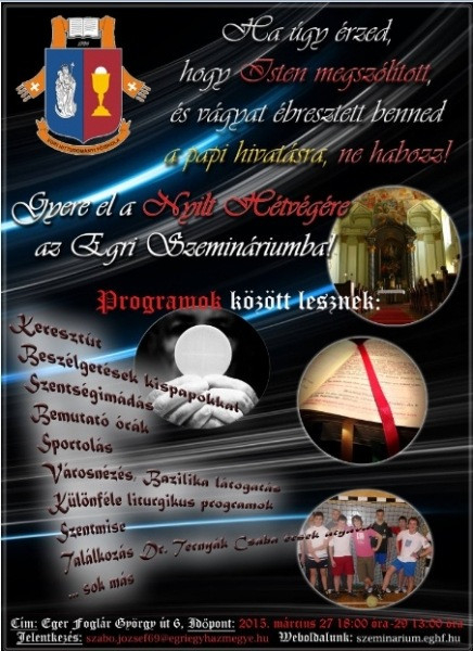 „Értük szentelem magam, hogy ők is meg legyenek szentelve az igazságban” – e mottó jegyében hív egész hétvégés nyílt napra az Érseki Papnevelő Intézet Egerbe. Középiskolás korú vagy annál idősebb fiatalokat várnak, az alsó korhatár tizennégy év. Az érdeklődőket március 27-én, pénteken 18 óráig fogadják a szemináriumban. A program március 29-én, vasárnap ebéddel fejeződik be.