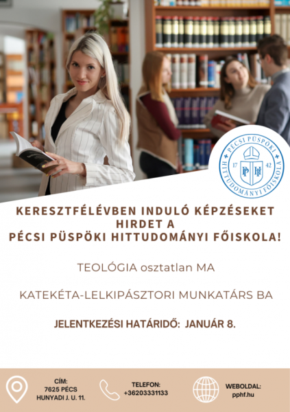Ezek mellett keresztféléves képzésekkel is várják a teológia iránt érdeklődőket teológia MA és katekéta BA szakokra, melyek jelentkezési határideje: 2024. január 8.