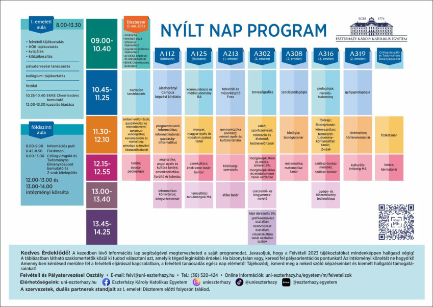 Egerben az Eszterházy tér 1. számú épületben reggel 8 órától egészen délután 14.30-ig készülnek különböző programokkal az érdeklődőknek. Felvételi tájékoztatók, intézményi körséta és a képzési kínálathoz kapcsolódó bemutatók segítenek megtapasztalni, miért is érdemes az Eszterházy Károly Katolikus Egyetemen tanulni.