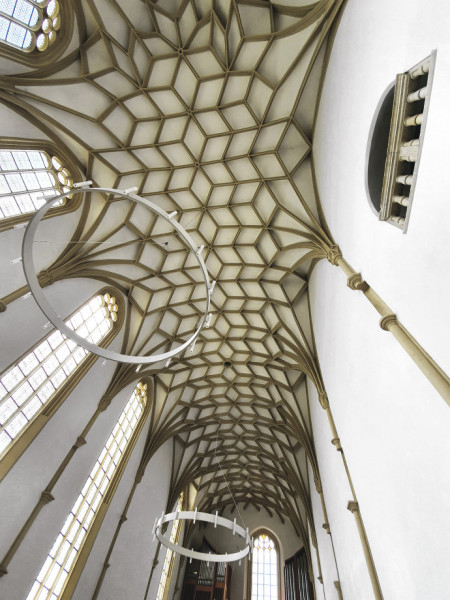 A zsoltáros hangulatba ringató szoborlátogatás után megcsodálhatjuk a magyarországi gótika első formájában Hunyadi Mátyás uralkodása idején felépült remekét, amelynek bizonyos elemei Mátyás király olasz és szászországi kapcsolatait idézik. A páratlan szépségű „halszálkás” boltozat alatt, különösen ma, a franciaországi templompusztulások idején, hálát mondhatunk azért, hogy annyi viszontagság közepette, Európa egyik keleti városkájában e világrész és e kultúra részének érezhetjük Magyarországot és önmagunkat, még akkor is, ha soha nem állhattunk, állhatunk meg a Notre-Dame, vagy a nantes-i székesegyház mennyezete alatt. A díszes építési felirat szerint: „E templom talpköve letétetett 1484-ben / építése elvégeztetett 1511-ben / az 1834-i földrengés által okozott / romlásai kijavíttattak 1834-ben / ismét kijavíttatott s új székekkel elláttatott / 1867.-ik évben.”
