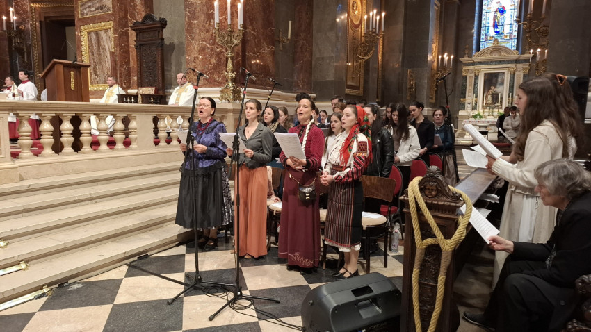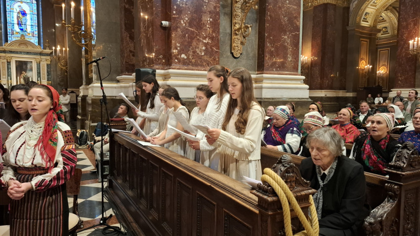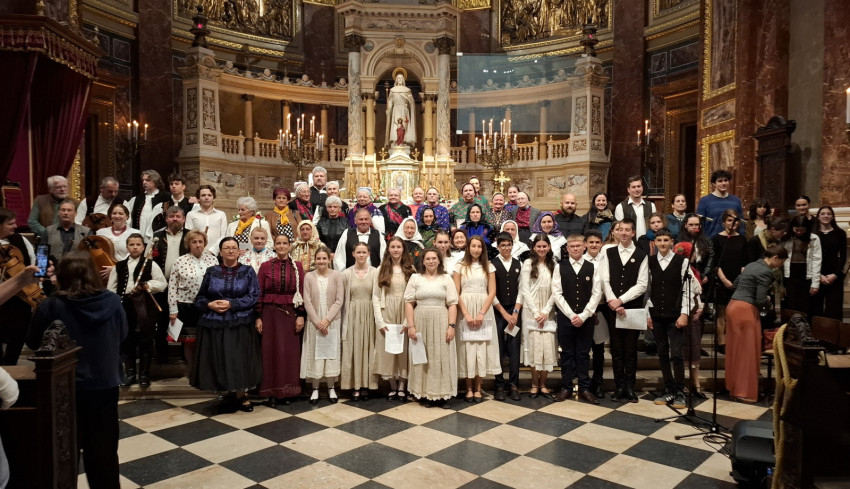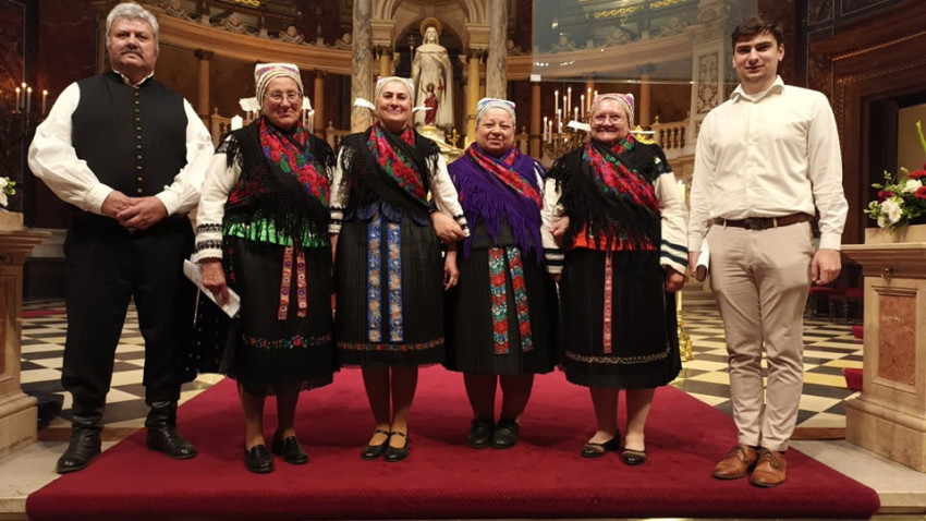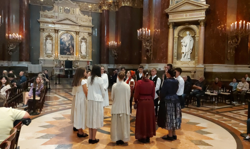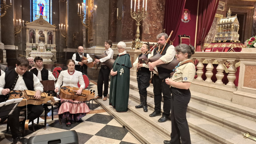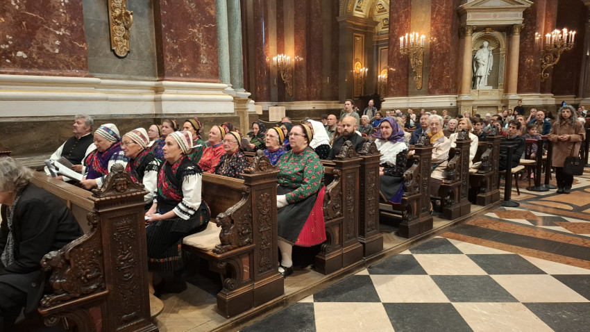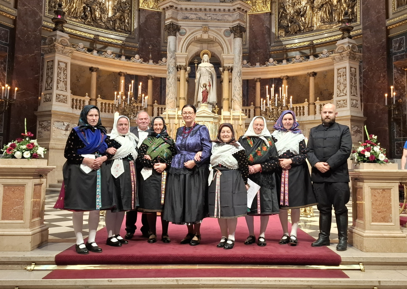 A zoborvidéki Szent István-ének előénekesei a Gímesi Hagyományőrző Csoport tagjai voltak, akik 2023-ban már egyszer részt vettek a Szent Jobb-misén.