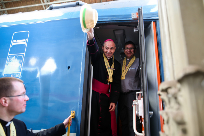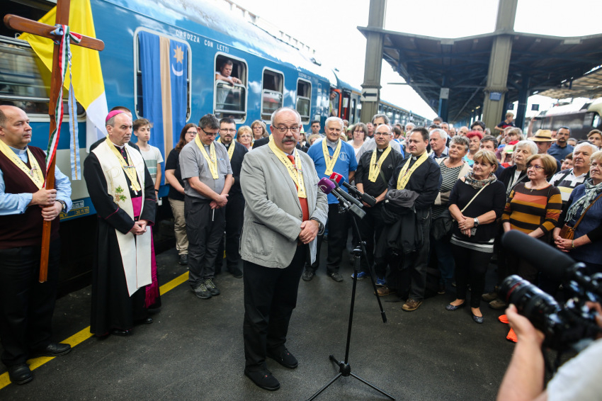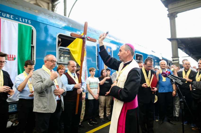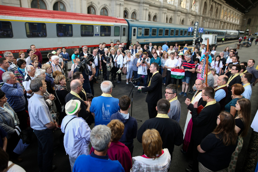 Az állomáson azonnal magával ragadja a vonatra várakozókat a találkozás-indulás hangulata. Egyik pillanatról a másikra megszűnnek az utazásra készülődés ügyes-bajos gondjai, ismerősök örömmel üdvözlik egymást. Sokan vagyunk, több mint ezren utazunk a 426 méter hosszú, 17 kocsiból álló vonaton, amit az a mozdony húz, melyet Erdő Péter bíboros e héten áldott meg és amelyen a Nemzetközi Eucharisztikus Kongresszus szimbólumai láthatók.