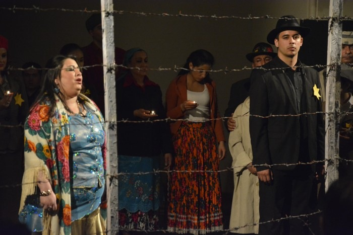 Az indító teljes sötétségben Choli Daróczi Józsefnek a tragédiát idéző gondolatai hangzottak fel cigányul, magyarul és héberül.