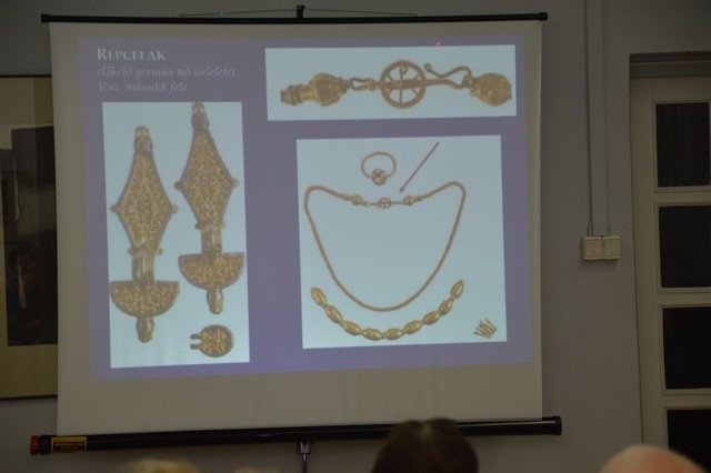 Répcelakon homokkitermelés közben egy helyi lakos 5. századból való germán női sírra bukkant. A sírból származó leletegyüttes része egy késő római nyaklánc, korong alakú zárótagján Krisztus-monogrammal és egy ezüstből öntött, ékvésett, aranyozott állatfejes tűs ruhacsat, azaz fibula – ismertette az előadó. Hozzátette, nem biztos, hogy csak ezek voltak a sírban. A sírt ugyanis nem a szakmai eljárásrend szerint rögzítették, emiatt sok kérdés maradt a leletekkel kapcsolatban.