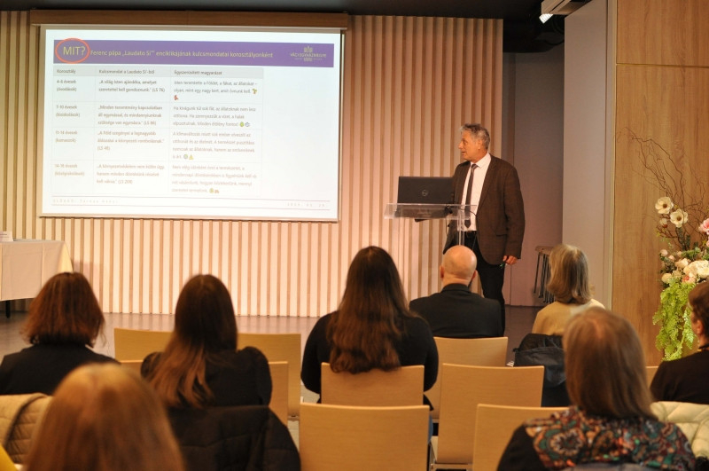 Tornay Gábor, a Váci Egyházmegye hitoktatási igazgatója a teremtésvédelem hitoktatásban betöltött szerepéről beszélt. A mesterséges intelligencia segítségével bemutatta, mit érdemes tanítani a teremtésvédelem kapcsán a különböző korosztályoknak, és hogyan tehetők motiválttá a gyerekek. Néhány gyakorlati példát is hozott; érdemes minden héten egy-egy teremtésvédelmi feladatot célul kitűzni a diákoknak, például hogy fogmosásnál használjanak poharat a víz folyamatos engedése helyett, vagy csak minden másnap tegyék fel a telefonjukat tölteni. Fontos emellett tudatos vásárlásra nevelni a fiatalokat, és arra ösztönözni őket, hogy több időt töltsenek a természetben.