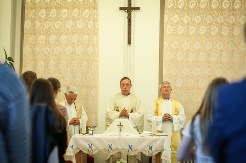 A szertartás előtt nagy volt a sürgés-forgás az épületben. Az apró kápolna nem tudott volna ennyi embert befogadni, ezért egy nagyobb termet rendeztek be „ideiglenesen kápolnának”. A Mária-intézet e célra átalakított helyisége jelezte: ez valóban otthona a diákoknak. Oldalt könyvespolcon sorakoztak a könyvek, egy asztalon számítógép, a fal mellett hűtőszekrények álltak. Szemmel láthatóan egy közösségi termet kellett a szentmise helyszínévé alakítani, hogy harmóniumnak, oltárnak, a szentmise résztvevőinek helyet biztosítson.