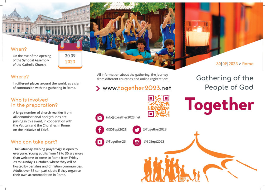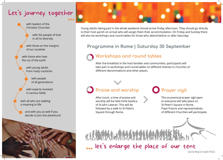 A Together, azaz Együtt elnevezésű kezdeményezésre különböző országokból 18 és 35 év közötti fiatal felnőttek ezrei érkeznek Rómába, akik szeptember 29. és október 1. között részt vesznek egy műhelymunkákból és találkozókból álló programon. Ennek keretében lesznek jelen az ökumenikus imavirrasztáson a Szent Péter téren, szombat délután pedig dicsőítő imán és szentségimádáson a lateráni Szent János-bazilikában.