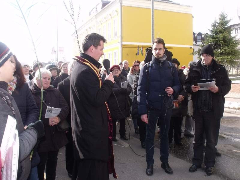 Az idén elhangzott elmélkedéseket Bosák Nándor püspök írta, még az irgalmasság évében. A Szent Antal-plébánia kápolnájától indult a menet. Felföldi László helynök, plébános bevezetőjében visszaemlékezett a huszonhét évvel ezelőtti, első városi keresztútra. Ezután Kis István prelátus mondta el az első stációhoz kapcsolódó elmélkedést.