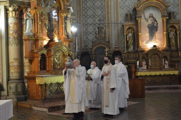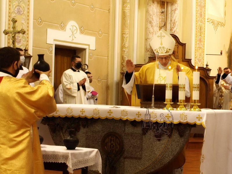 A munkácsi Tours-i Szent Márton székesegyházban nagyszerdán délelőtt tartották az olajszentelési szentmisét. Az egyházmegye papjai püspökeikkel együtt mutatták be a szentmisét, melyen közösen megáldották a szentségek kiszolgáltatásához szükséges olajokat és megújították papi ígéreteiket. A szentmise nyelve szokás szerint a latin, a magyar és az ukrán volt, az énekek is felváltva szólaltak meg e nyelvek egyikén.