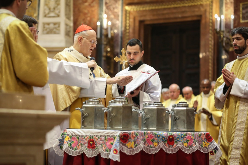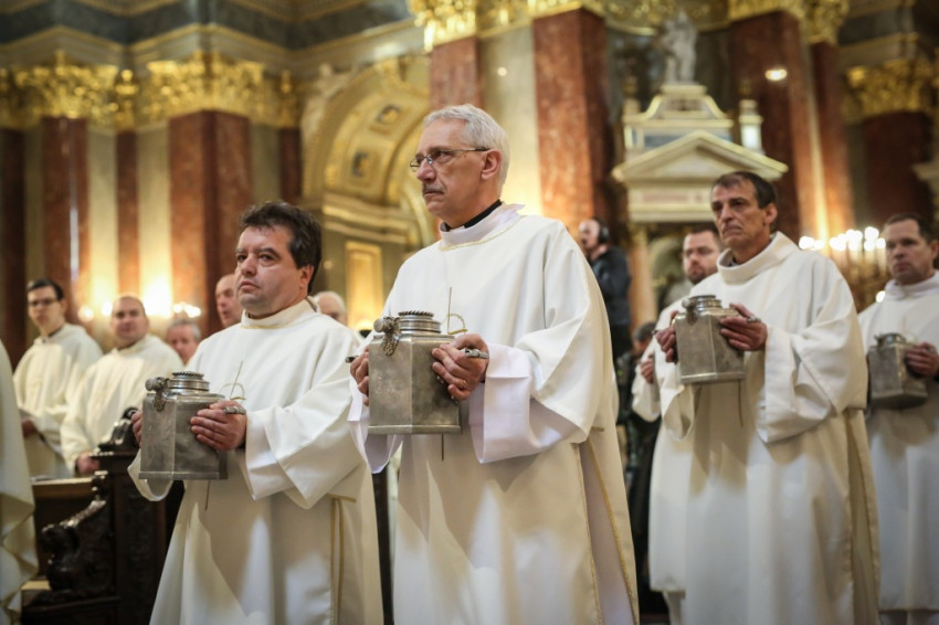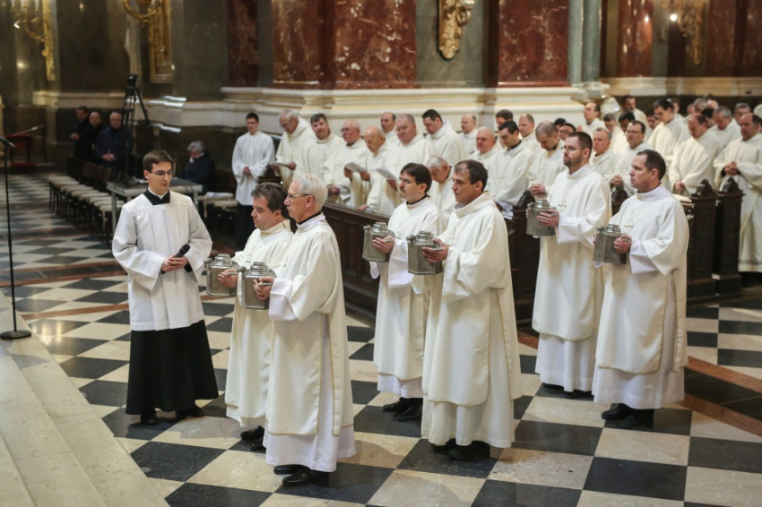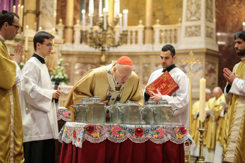 Nagycsütörtök délelőtt az olajszentelési szentmise vezeti be a szent három nap ünneplését. Erdő Péter bíboros az Esztergom-Budapesti Főegyházmegye papságával és az egyházmegye területén szolgáló szerzetes papokkal közösen mutatta be a szentmisét, melyen koncelebráltak a főegyházmegye segédpüspökei, Snell György és Cserháti Ferenc, valamint teljes papsága, illetve együtt ünnepeltek a főegyházmegye diakónusai és hívei is.
