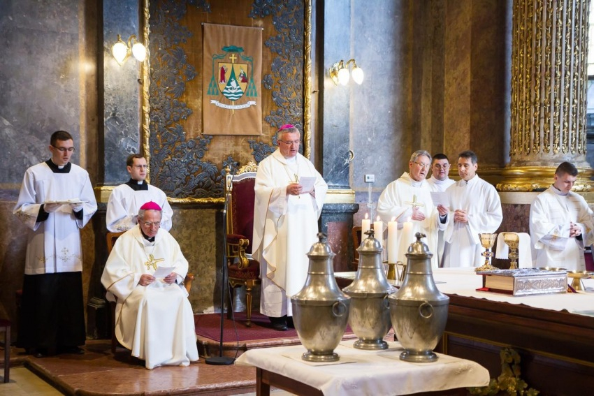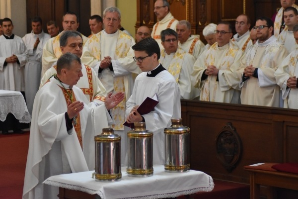 Nagycsütörtökön Bábel Balázs érsek vezette a hagyományos olajszentelési szentmisét a kalocsai főszékesegyházban. Beszéde kezdetén lélekben a Duna eredetéhez vezette el a jelenlévőket, ahol nem szélesebb néhány méternél. Mire a kalocsai egyházmegye területére ér, félelmetes folyammá dagad. Ezzel a képpel tette érthetővé a „Minden forrásom belőled fakad” jelmondatot. Az utolsó vacsora terméből indult, s mekkora hatalmas áradat lett az Eucharisztia titkából! Megvalósul, hogy „napkelettől napnyugatig tiszta áldozatot mutatnak be”, hiszen szinte minden percben felhangzik az átváltoztatás szava valahol a világon. „Isten oltárához járulok, aki megörvendezteti ifjúságomat” – ezzel az ifjú lendülettel kell a papnak minden miséhez járulni. Papjait figyelmeztetve az érsek hangsúlyozta, hogy úgy kell bemutatni a szentmisét, mintha az lenne az első és utolsó misénk.