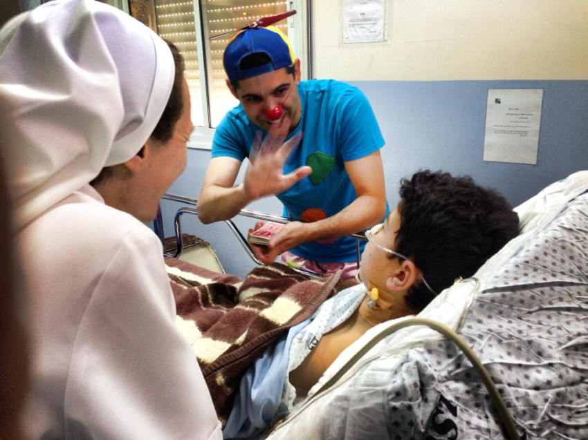 Marco júliusban a jeruzsálemi Szent József kórházban dolgozott a gyerekekkel, akiket ide szállítottak a Gázai övezetből, hogy orvosi kezelést kapjanak. Augusztusban Gázában, az egyetlen katolikus plébánián ütötte fel tanyáját. Egyik napról a másikra él, és igyekszik minden lehetőséget megragadni, hogy egy kis örömet csempésszen a gyerekek és az emberek életébe az iskolákban, egy elsősegély-állomásokon, családlátogatáson, vagy egyszerűen csak az utcán, ahol találkozik az emberekkel. Maga köré gyűjti a gyerekeket a romok közül és bemutatót tart nekik. Gyorsan felhangzik a nevetés a törmelékhegyek között guggoló kis csoportban. Egy színes léggömb, egy kis bűvésztrükk, egy grimasz a gumiarcon: mindez elegendő, hogy megtörje a pillanat komolyságát és a bohócterápián keresztül egy kis nyugalmat és megkönnyebbülést varázsoljon a gyermekeknek.