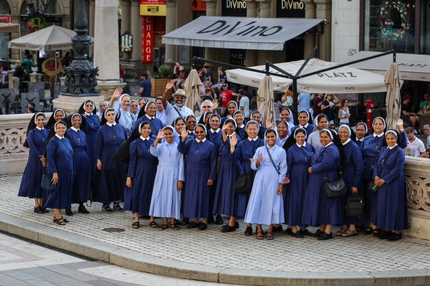 A Csacsi-réten ér bennünket a telefon, hogy jó lenne találkoznunk egy másik zarándokcsoporttal is: a parlamentet, a Gellérthegyet, a Sziklatemplomot, a Hősök terét és a bazilikát Madassery Sebastian atya idegenvezetésével felkereső bécsi szerzetesnővérekkel, akik csak ma vannak itt. Ez a lehetőség nagyon fellelkesít bennünket, ezért visszasétálunk az autóhoz, és keresésükre indulunk. Először az a terv, hogy a Hősök terén érjük be őket, de aztán inkább a bazilikánál várunk rájuk. Csak körülbelül egy óra múlva érkeznek meg, amikor már majdnem feladjuk. Ők is különböző helyszínein élnek-dolgoznak a világnak: Szlovákiában, Ausztriában, Németországban, Indiában és a Fülöp-szigeteken. Határok nélkül, hiszen katolikusnak, azaz egyetemesnek lenni maga a határok, a más nemzetektől való elzárkózás tagadása, mondja Sebastian.