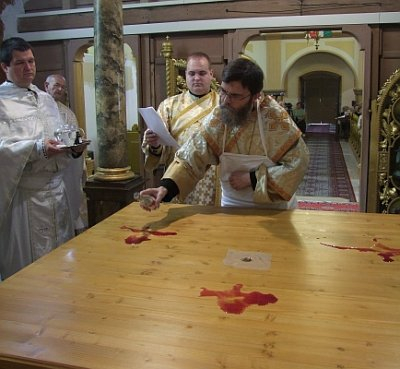 Az oltárszentelést megelőzte a tömjénezés, a háromszori lemosás: vízzel, rózsavízzel és vörösborral, majd az ereklye elhelyezése az oltár közepén, és viasszal való rögzítése. A myróval kereszt alakban történő megkenés, felszentelés által vált a legszentebb áldozat bemutatásának méltó helyévé a fából készült oltár. A szentély „megtelt a kenet illatával".