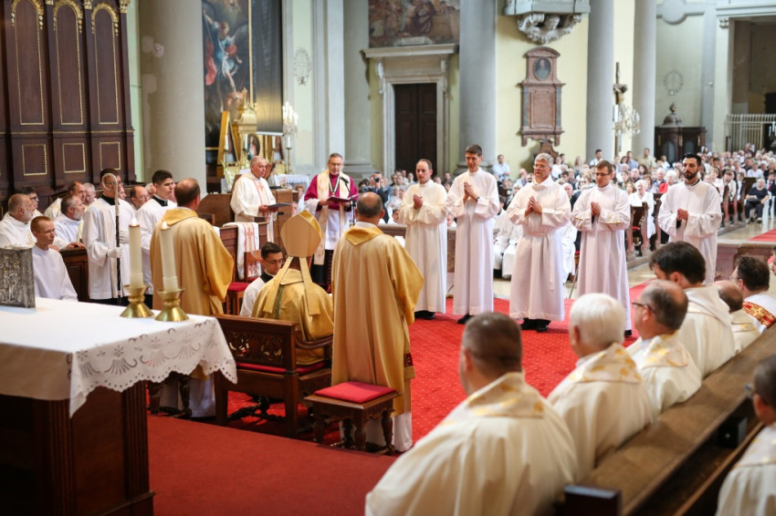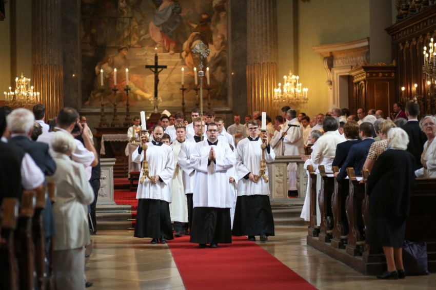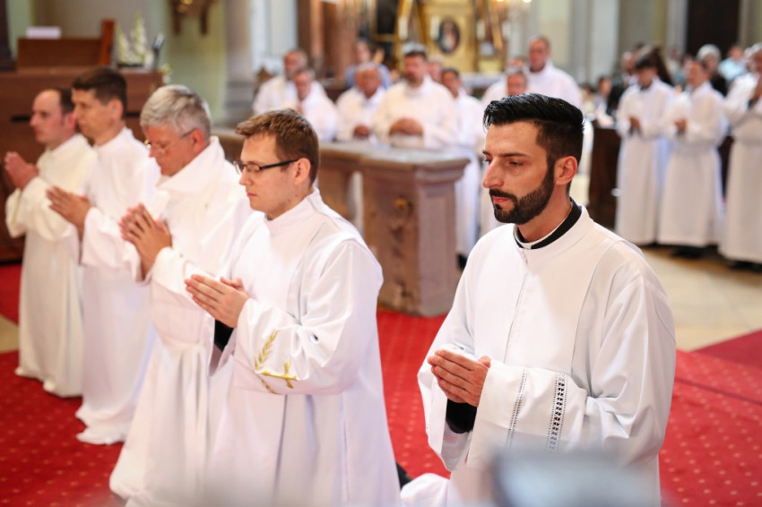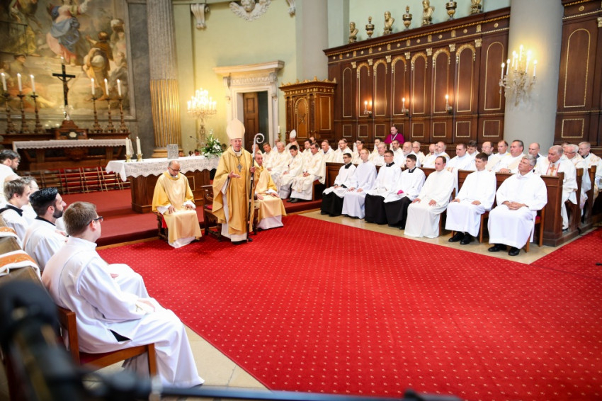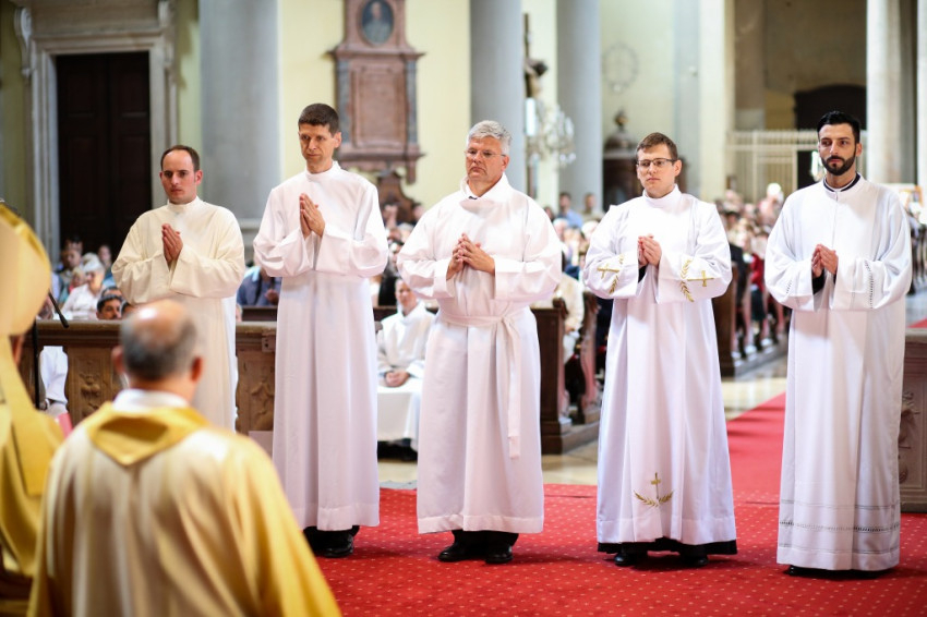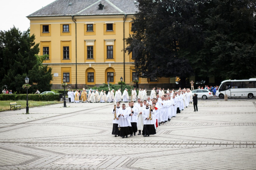 Hosszan kígyózott a liturgikus menet a püspöki palotától a Konstantin téren át a székesegyházba. Az egyházmegye papsága, állandó diakónusok, akolitusok vonultak be együtt ünnepelni a templomot megtöltő hívekkel, hogy Isten hívását ismét elfogadja öt férfi.