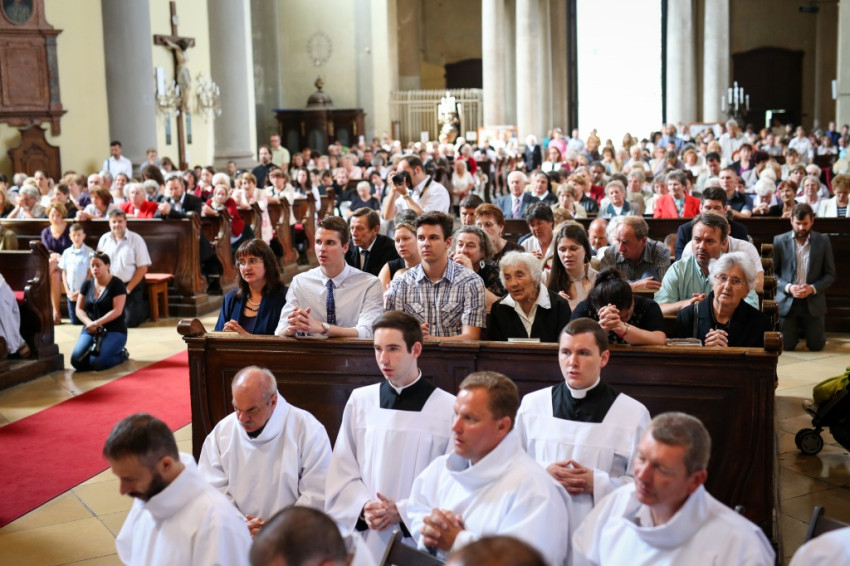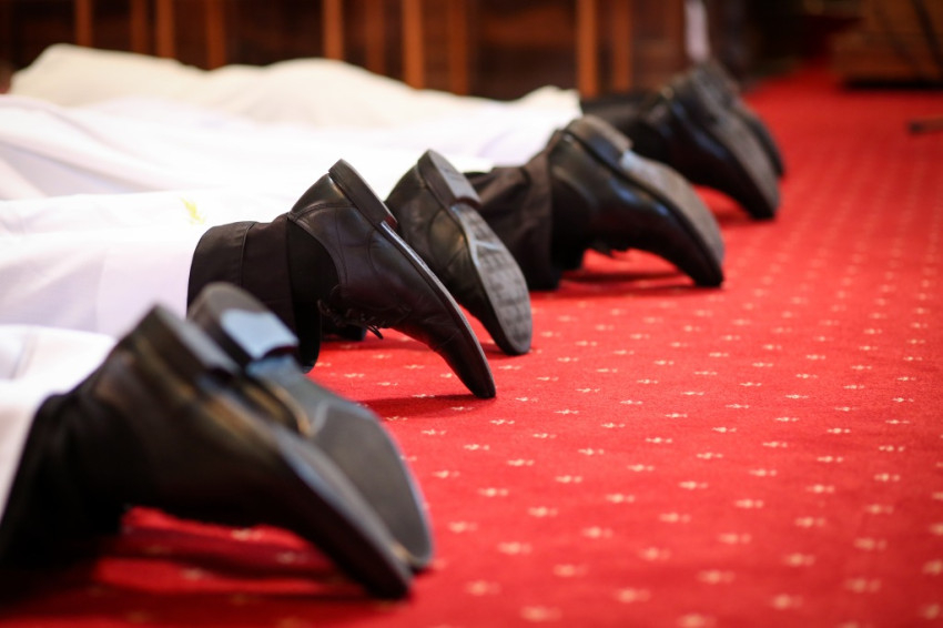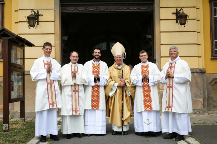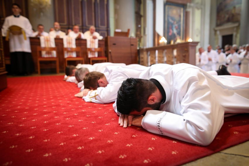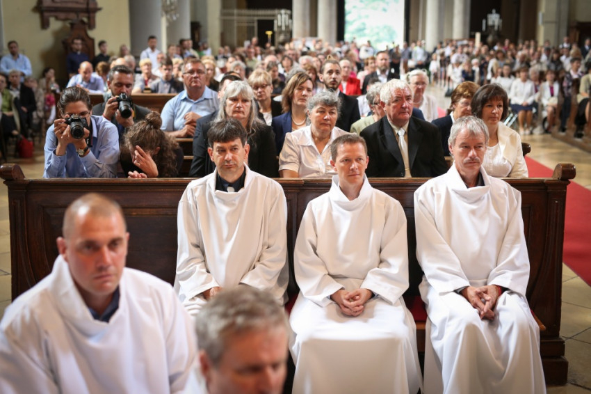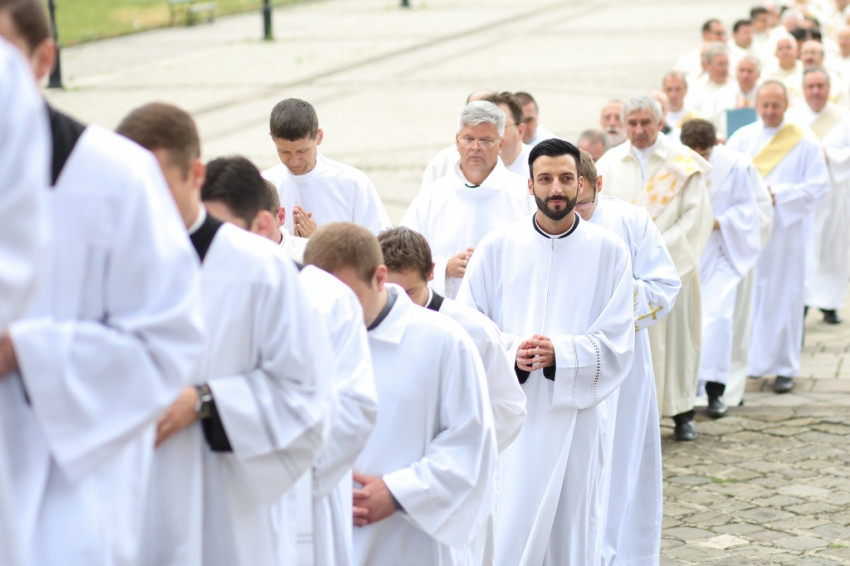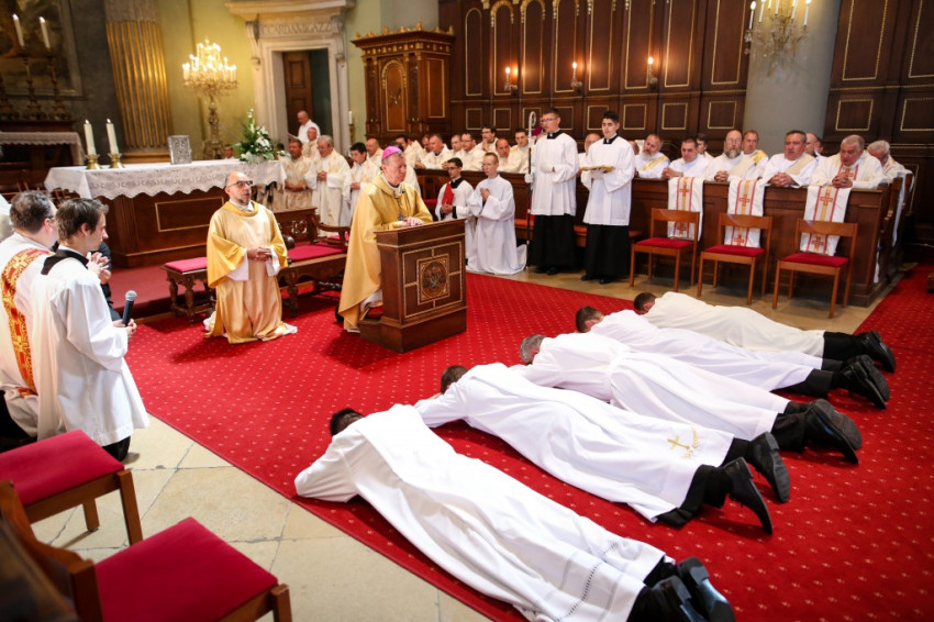 Hosszan kígyózott a liturgikus menet a püspöki palotától a Konstantin téren át a székesegyházba. Az egyházmegye papsága, állandó diakónusok, akolitusok vonultak be együtt ünnepelni a templomot megtöltő hívekkel, hogy Isten hívását ismét elfogadja öt férfi.