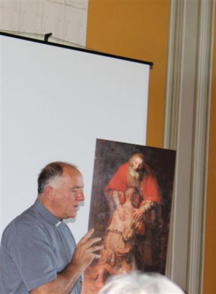 Csáki Tibor atya új megvilágításban mutatta be az Irgalmas Atya képét, felidézve az irgalmasság testi és lelki cselekedeteit, majd A tékozló fiú hazatérése című Rembrandt-kép „elemzésével” folytatta előadását – ennek segítségével szembesítette a résztvevőket önmagukkal.