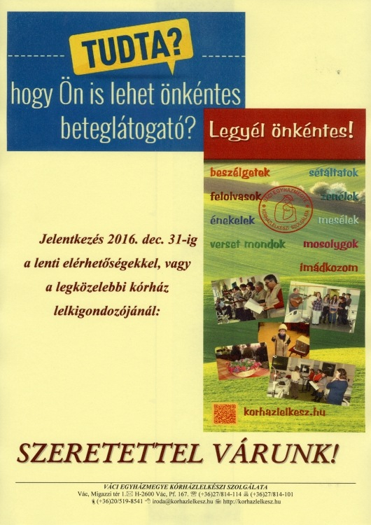 Jelentkezni lehet december 31-ig az iroda@korhazlelkesz.hu e-mail-címen, a plakáton megadott telefonszámokon, a legközelebbi kórház lelkigondozójánál, illetve az ITT található jelentkezési lapon.
