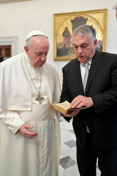 Ferenc pápa és Orbán Viktor a megbeszélést követően átadták egymásnak ajándékaikat.