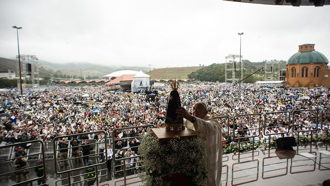 A Szentatya utalt 2013-ban tett felejthetetlen brazíliai útjára. Akkor egyik beszédében az Aparecidai Miasszonyunk történetére utalt, akinek összetörten megtalált szobra a brazíliai valóság jelképe lehet ma. „Ami egykor széttörött, most újból eggyé lehet. Aparecidában Isten a kezdetektől fogva üzenetet ad a széttöredezett összeillesztéséről, a megosztottak egységesítéséről. A falaknak, a mélységeknek, a ma is jelen lévő távolságoknak meg kell szűnniük. Az Egyház nem hagyhatja figyelmen kívül ezt a tanulságot: az Egyháznak a megbékélés eszközének kell lennie” (Beszéd a brazil püspökökhöz, 2013. július 27.)