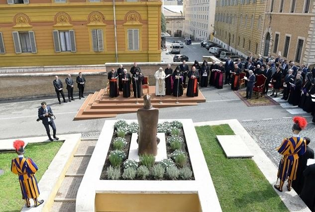 A szobor makettjét 2016 júniusában, örményországi apostoli útja során mutatták be Ferenc pápának. Felavatása alkalmat adott, hogy jobban elmélyítsék a Szentszék és Örményország, valamint az örmény apostoli egyház és a Katolikus Egyház közötti kapcsolatokat. Ferenc pápa április 5-én délelőtt Szerzs Szargszjant, Örményország elnökét és kíséretét fogadta, majd pedig II. Karekin pátriárka, örmény katholikosz és kísérete, valamint I. Aram, a cilíciai örmény apostoli egyház katholikosza és kísérete járult a pápa elé.