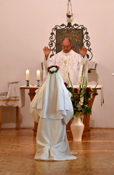 A szertartást Puskás Antal pálos tartományfőnök vezette. A jelen levő nővérek testvéri közösségében, a szentmise keretében először egy imádságos, az elöljáró által vezetett párbeszédben mondott határozott igent M. Franciska nővér a közösség küldetésére. E küldetés a szentségre törekvésre, rejtett engesztelő életre és – kiemelve a magyar nemzetért és egyházért való imádkozást – az Oltáriszentség előtt való imádó, közbenjáró imára hív.
