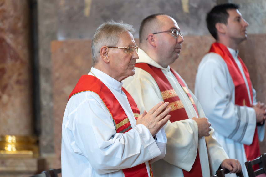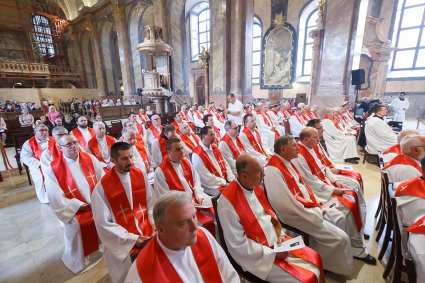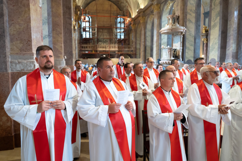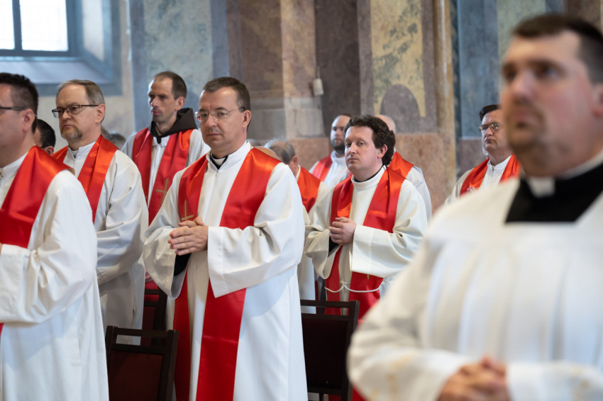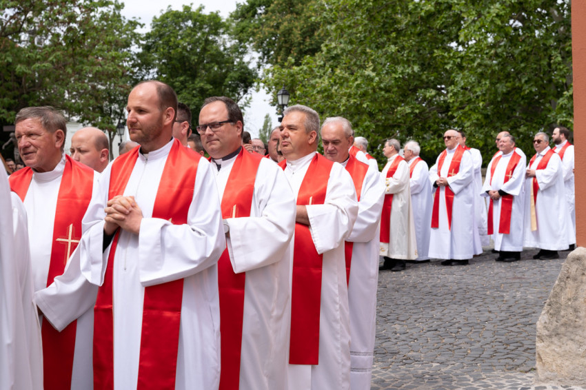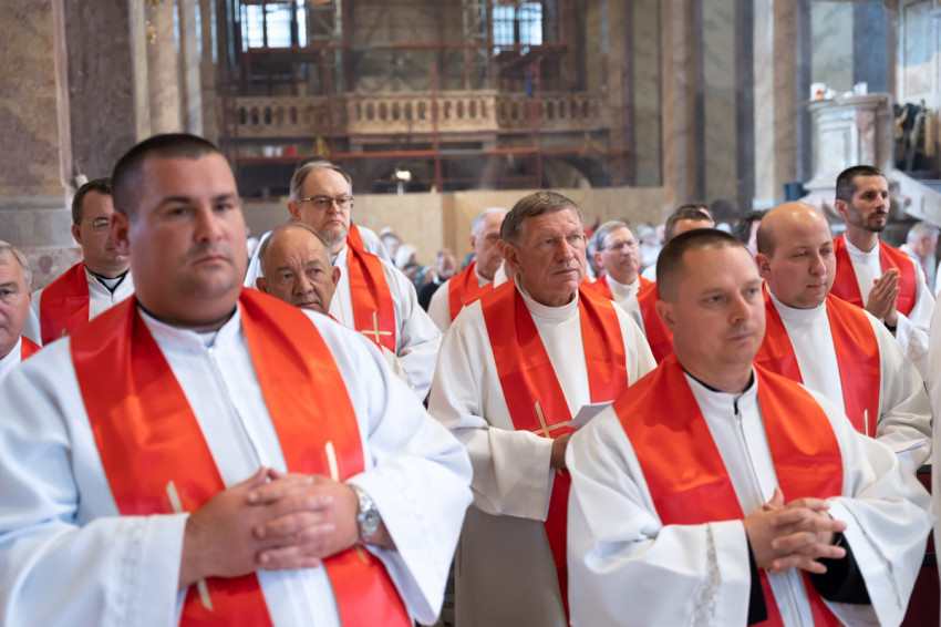 Most csöndet tartunk, és hívjuk a Lelket, hogy segítsen minket megújulni és megújítani a föld színét – mondta végül a szombathelyi segédpüspök, ismét a lelkipásztorokat megszólítva. – Jó rátok nézni. Piros nyakkendő helyett piros stólában vagyunk együtt.