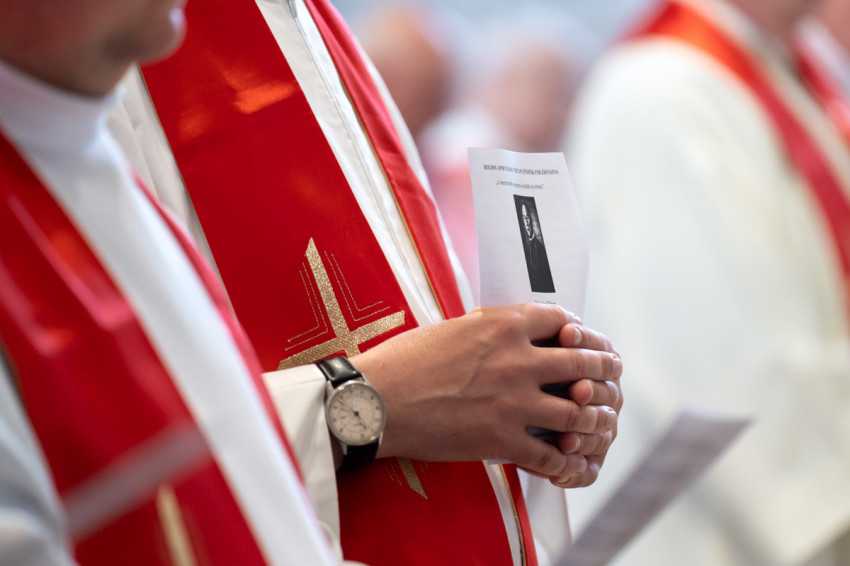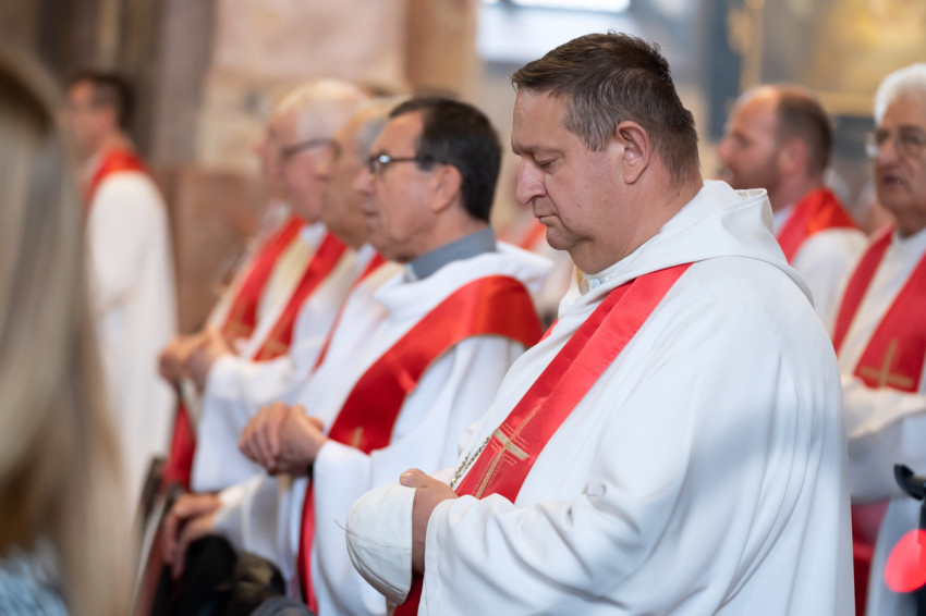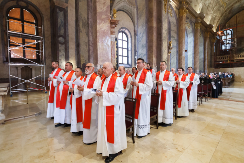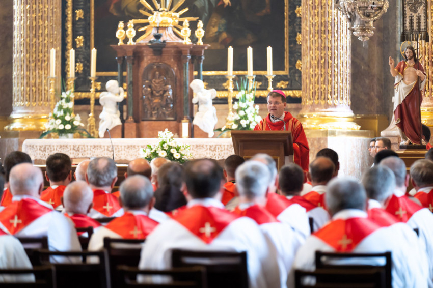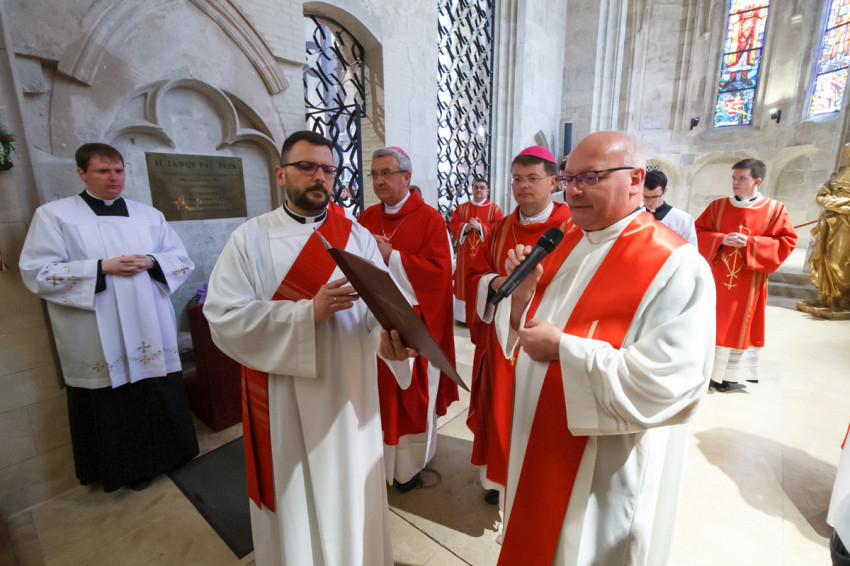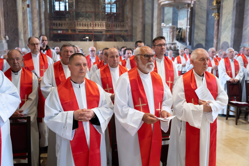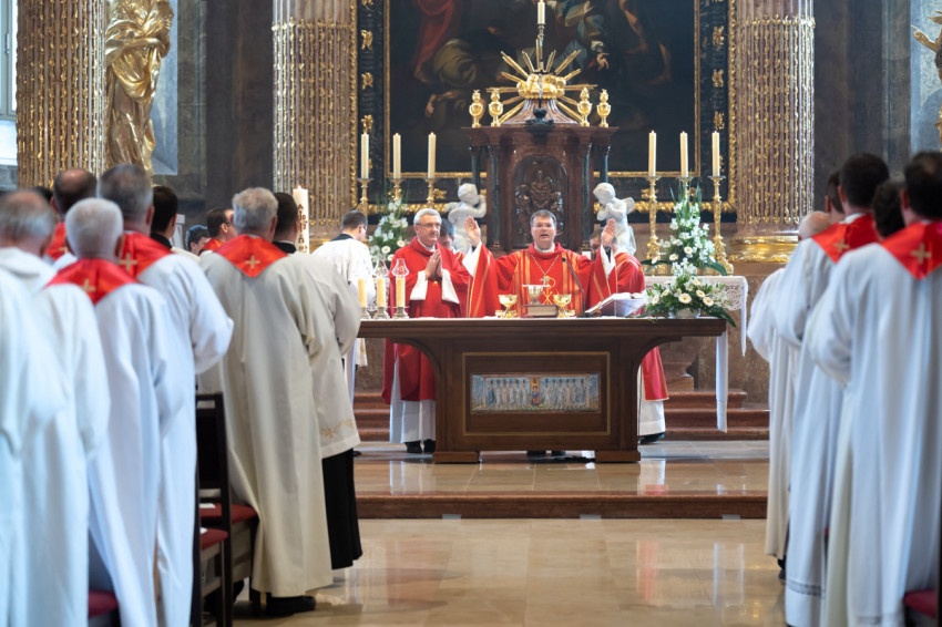 Most csöndet tartunk, és hívjuk a Lelket, hogy segítsen minket megújulni és megújítani a föld színét – mondta végül a szombathelyi segédpüspök, ismét a lelkipásztorokat megszólítva. – Jó rátok nézni. Piros nyakkendő helyett piros stólában vagyunk együtt.