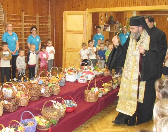 A gyermekek szeretettel köszöntöttek Atanáz püspököt és Bialkó Mária igazgató asszonyt, a fenntartó képviselőjét. A kicsik hálájukat rövid ünnepi műsorral fejezték ki a Teremtőnek, aki a természet zamatos gyümölcseit nekünk ajándékozta testi egészségünk megvédéséért és gondviselő szeretetének megtapasztalásáért.