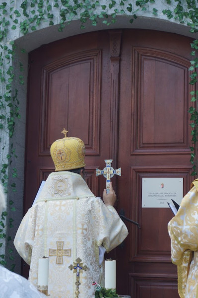Az ünnepi szertartás a templom főbejáratánál kezdődött. A zárt templomajtó előtt mondott imádságok után Orosz Atanáz püspök körmenetben szenteltvízzel hintette meg a templom külső falait.