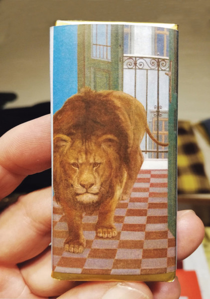 Az oroszlános csokoládét a múzeum shopjában lehetett megvásároni. Azonnal vettem belőle néhányat az ismerőseimnek. A múzeumi shopot azért is szeretem, mert visszaránt a földre. Nem hagyja elburjánzani a nagy érzelmeket. A mindenféle ajándéktárgyak – a kitűzők, kis tükrök, a nagy magyar költőink villamosbérlet-igazolványaival díszített jegyzetfüzetek – azt sugallják, hogy az élet megy tovább, és a világ nemcsak tragikus, hanem ironikus, humoros is. A szürreális jelenetek, amelyek Mácsai képein gyakran megjelennek, – mint például Bruegel Vadászok a hóban című képének parafrázisa a Szent István körúton –, így válnak igazából népszerűvé. És ez esetben nem az oroszlán fal fel minket, hanem mi esszük meg őt, csoki formájában.