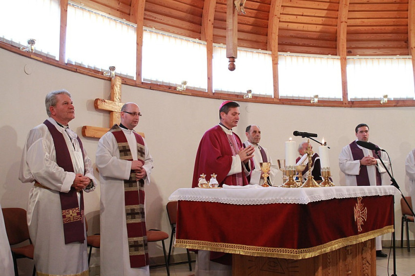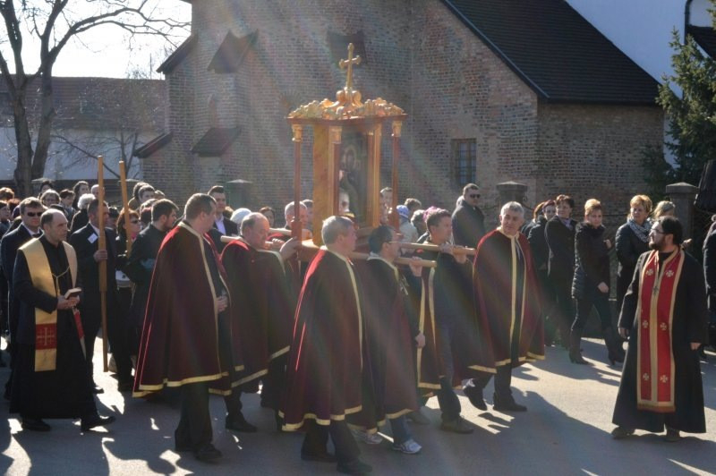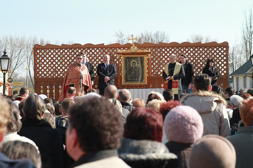 A köszöntőket követően a kegyképet gyalogosan kísérték át a Makovecz Imre tervei alapján 2000-ben épült ,,angyalszárnyas” templomba, ahol Kocsis Fülöp hajdúdorogi megyéspüspök üdvözölte az egybegyűlteket, majd megkezdődött a paraklisz (könyörgő ájtatosság az Istenszülő Szűz Máriához. A görög παράκλησις ’odahívás, segítségül hívás, kérés; buzdítás, felszólítás; vigasztalás’ szóból – A szerk.). Ezután következett a rozsályi és csegöldi egyházközség, majd az Orfeusz Egyesület és a Támasz-Pont műsora. A nap római katolikus szentmisével folytatódott, melyet Schönberger Jenő szatmári megyéspüspök celebrált. Ezt Nagy Szent Bazil Liturgiája, majd a vecsernye követte.