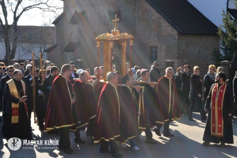 A kegykép 13.30-kor, rendőri felvezetéssel érkezett meg Csengerbe, hogy rövid ideig a Szent István téren váljék láthatóvá a hívek számára. Miután a kegyképet elhelyezték a város főterén felállított színpadon, Ignácz András parókus köszöntőjében elmondta, hogy ez egy olyan nap, mikor a város főterén nemcsak az utcák érnek össze, hanem a szívek és a lelkek ugyanúgy. Forján Zsolt, Csenger polgármestere amellett, hogy köszöntötte a városba érkezőket, kiemelte: „a mai nap kettős ünnep Csenger számára, hiszen amellett, hogy március 8-án ünnepeljük a hölgyeket, ugyanezen az ünnepi napon érkezett Csengerbe a magyar és egyetemes történelem páratlan kulturális értékkel bíró, hazánkban és külföldön is egyaránt tisztelt, féltve őrzött ereklyéje, az Isten fiának életet adó Szűz Máriát ábrázoló kegykép.”