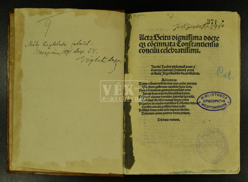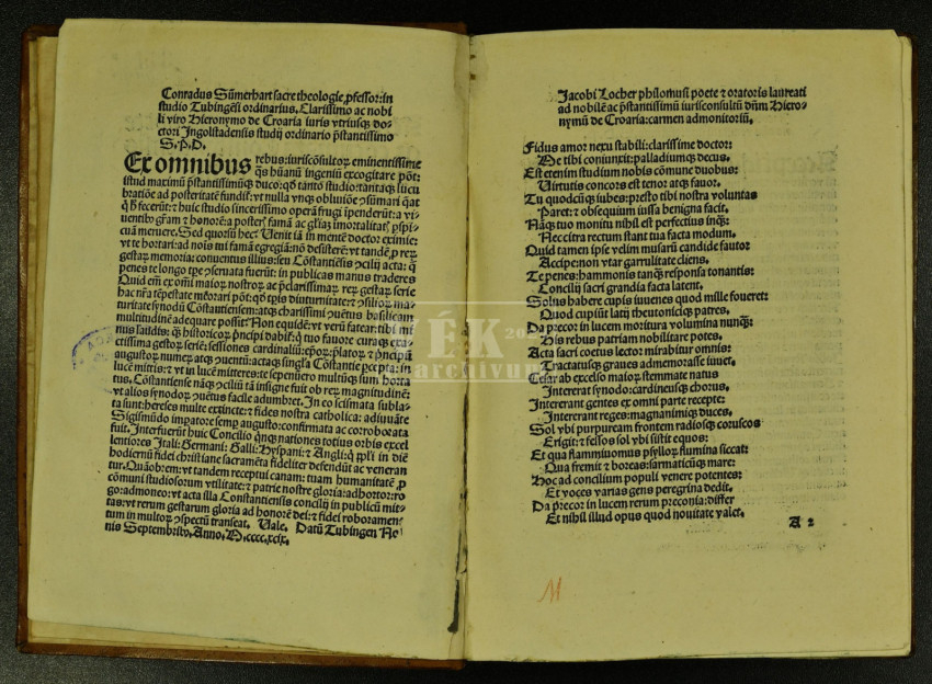 Könyvészeti leírása: VÉK 371. Concilium Constantiense. Acta et decreta. Ed. Jacobus Locher Philomusus et Conradus Summenhart. Hagenau: Heinrich Gran, pro Johanne Rynman, 11. Apr. 1500. 112 ff.