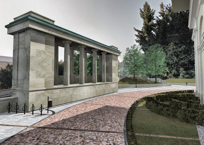 Az épülő oszlopsornak jelenleg a vasbeton szerkezete látható, az oszlopok beemelése után a felső részt ugyancsak vasbetonnal fedik majd, az erre kerülő ácsszerkezeten rézlemez borítás lesz. A vasbetont az oszlopok anyagával azonos süttői kővel fogják burkolni.