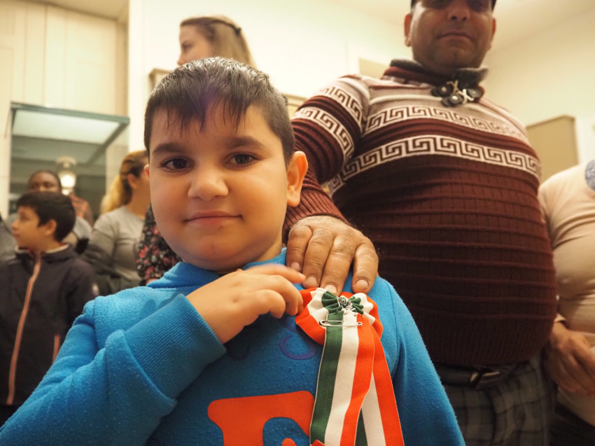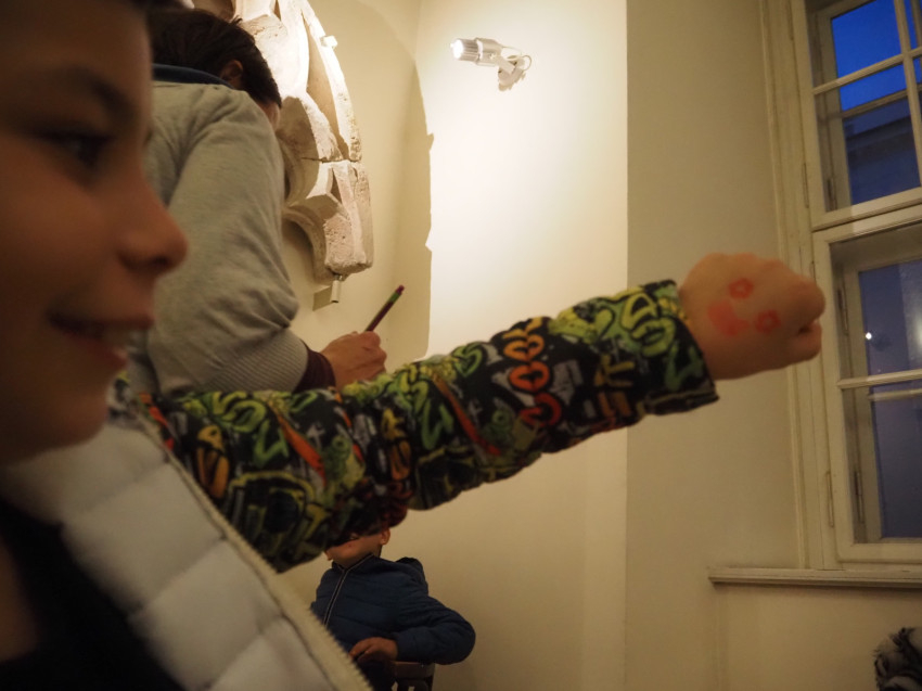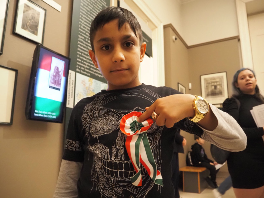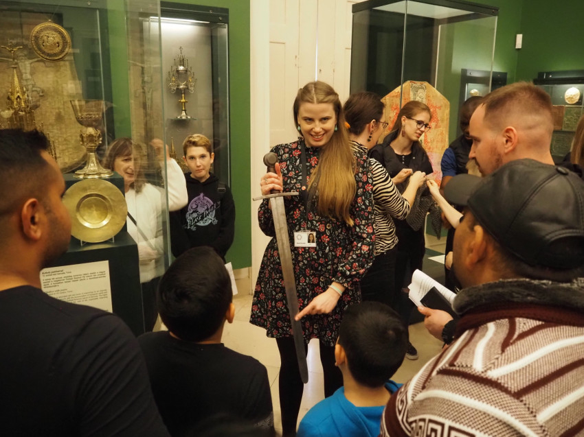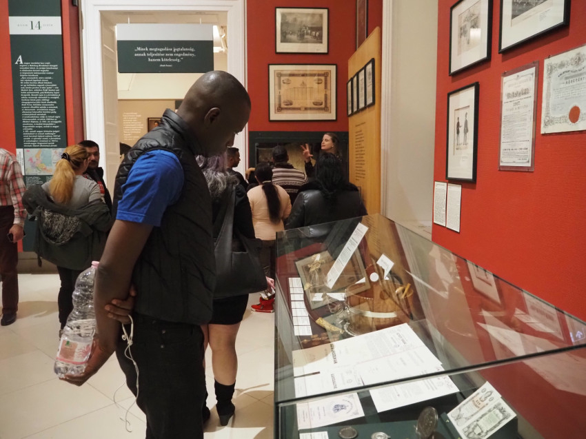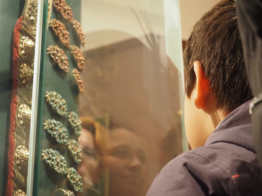 A Nemzeti Múzeum tárlatán rácsodálkoztunk az aprólékosan kidolgozott, értékes anyagokból készült koronázási palástra, megismertük a 15. századi csontnyeregre faragott szimbólumokat, láttuk többek között Mátyás király trónkárpitját, Brandenburgi Katalin esküvői ruháját, Batthyány Lajos mellényét. Kecskés Flóra múzeumpedagógus kedvesen és figyelmesen vezetett végig a tárlaton, a gyerekeket sem hagyta szórakozás nélkül: örömmel vették kézbe a korabeli kardot, öltötték magukra a kokárdát – ha nem is a Szendrey Júlia által Petőfinek készített darabot –, vidáman fotózkodtak.